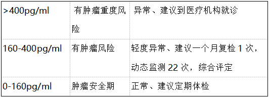 ●如果两次检测结果均为阳性并至少有一次在400pg/ml以上,建议给予关注,进行更为全面的检查,如未查出肿瘤,建议检测者改变现有生活方式,保持良好心情,3~6个月复查一次。