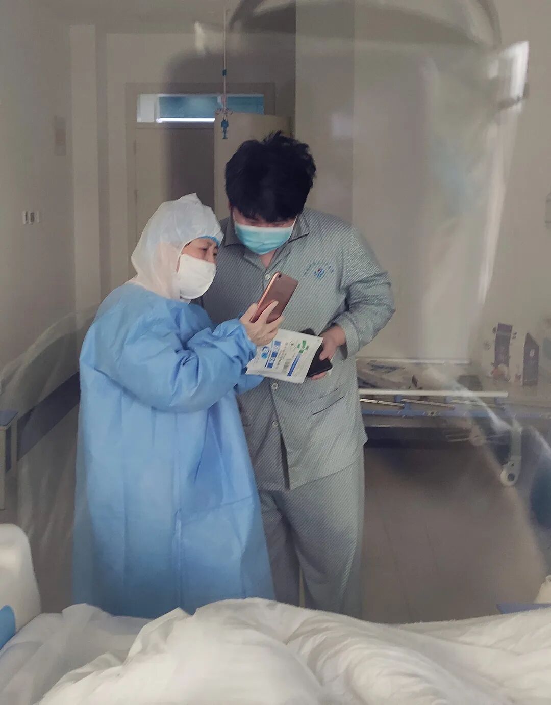 曾经有位吴姓患者,咳嗽、发热、胸部CT提示双肺感染,情绪一直非常焦虑。为了让他放宽心配合治疗,王传花主任多次与他沟通,并把入院时与治疗中复查的胸部CT做成对比图,给他反复讲解,让他看到病情在逐步好转,树立信心。了解到患者因隔离心情急躁,王传花就安抚他“目前你抵抗力低,为了自己和家人安全,更需要控制住感染,体温正常,再开开心心回家。我们医护人员和你一样,吃住都在这里。始终陪在你和其他患者身边,加油!”在大家的帮助下,小吴很快康复出院。