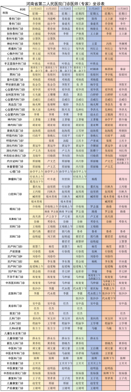 为更好地方便广大患者就医问诊,现将河南省第二人民医院门诊医师(专家)坐诊表(2025年11月24日—11月30日)公布如下。