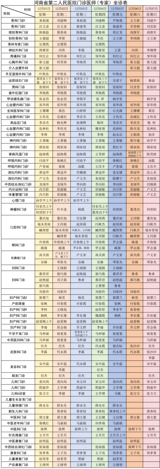 为更好地方便广大患者就医问诊,现将河南省第二人民医院门诊医师(专家)坐诊表(2025年12月1日—12月7日)公布如下。