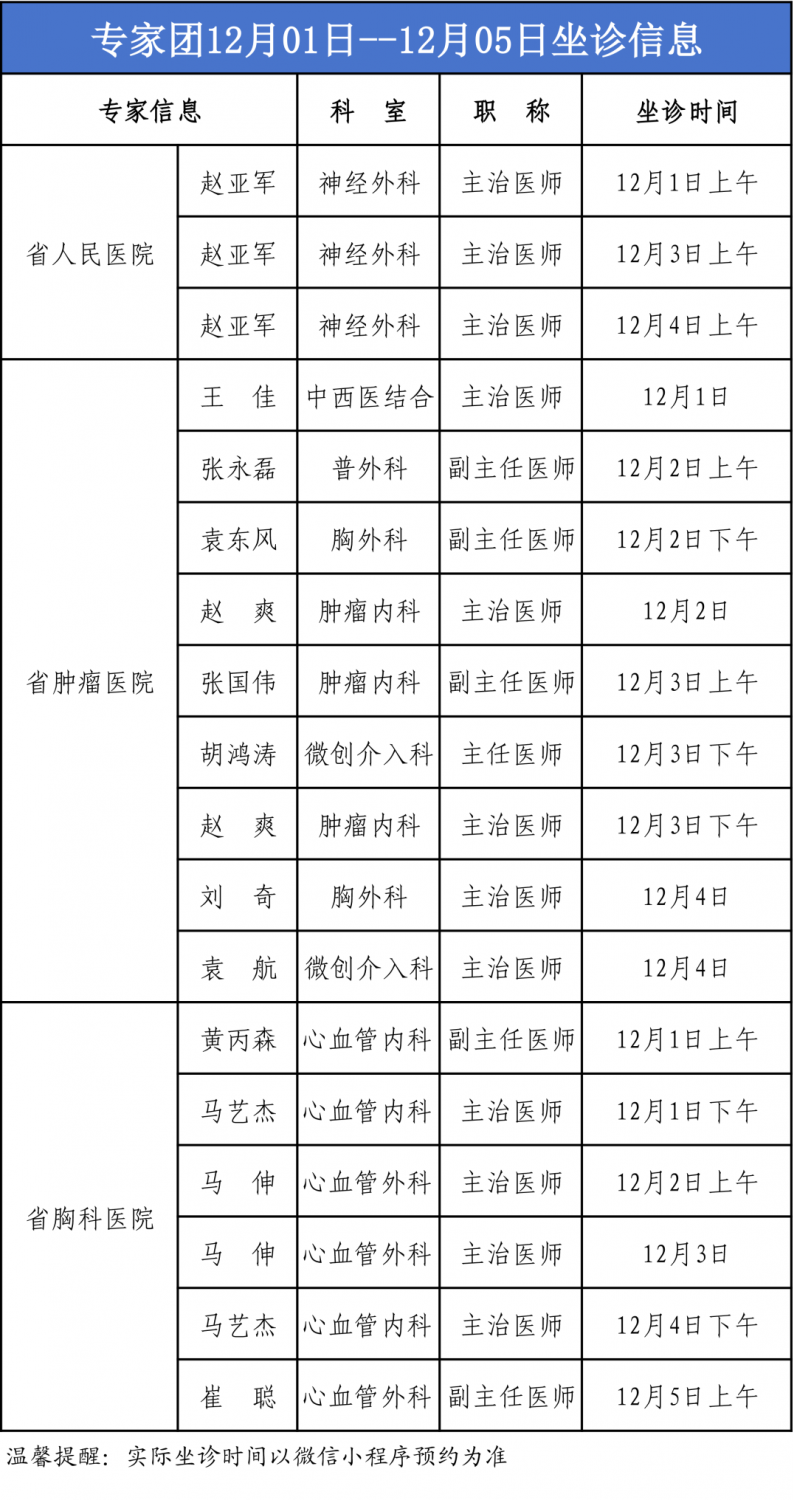 河南省人民医院、河南省肿瘤医院、河南省胸科医院专家团坐诊表(12月1日——12月5日)