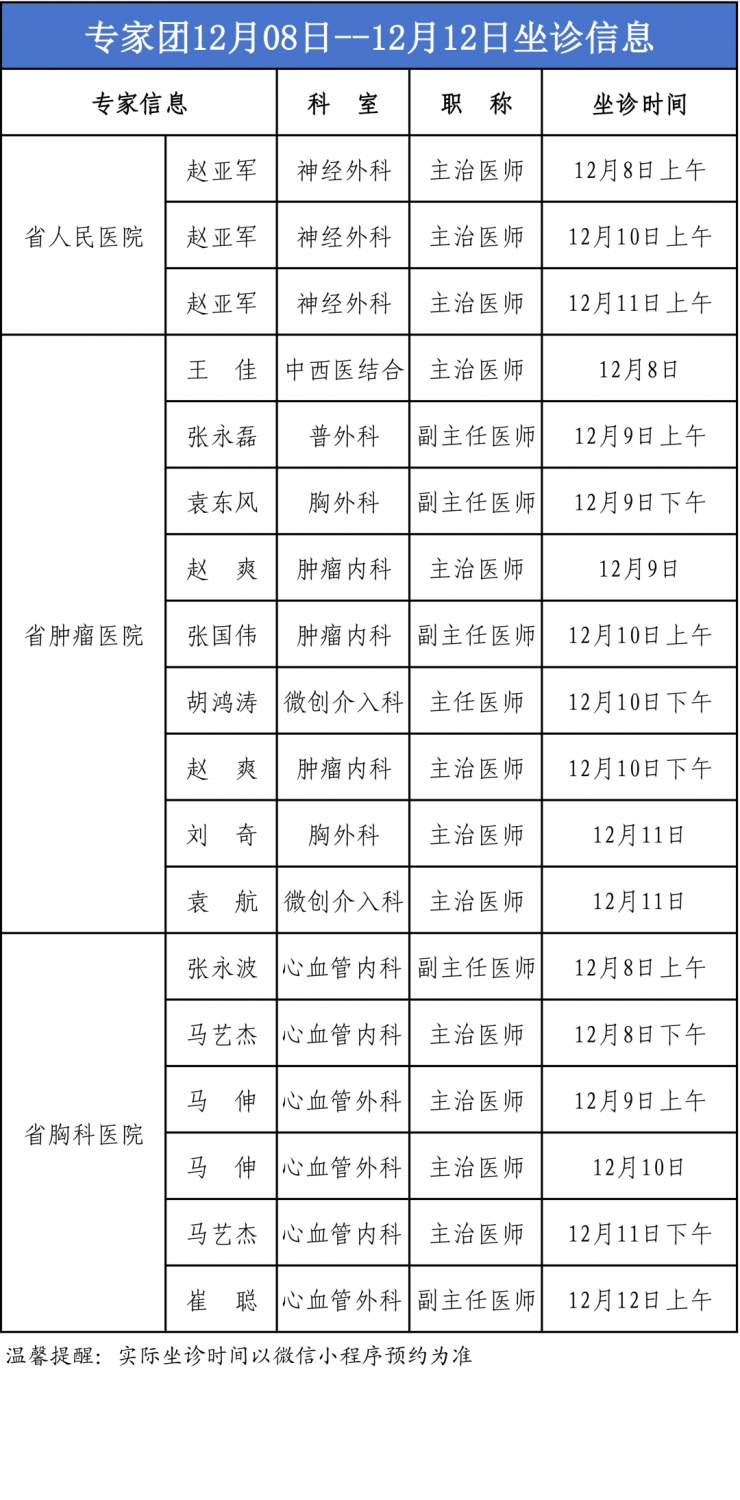 河南省人民医院、河南省肿瘤医院、河南省胸科医院专家团坐诊表(12月8日—12月12日)