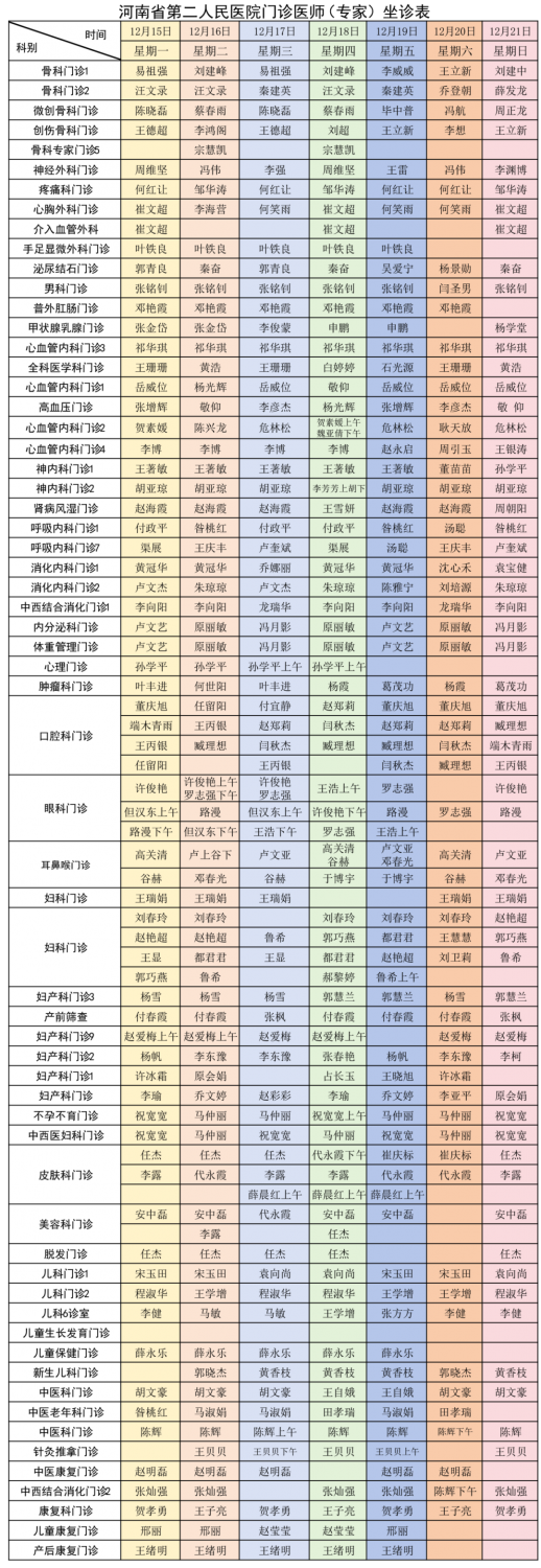 河南省第二人民医院门诊医师(专家)坐诊表(2025年12月15日—12月21日)