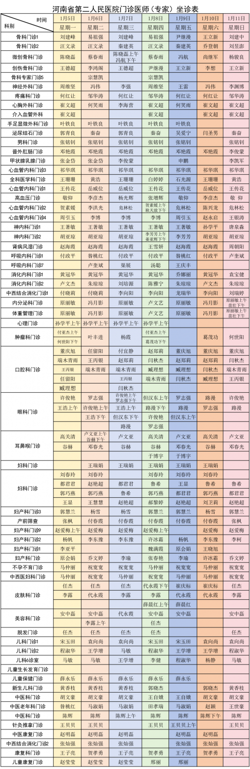 河南省第二人民医院门诊医师(专家)坐诊表(1月5日—1月11日)
