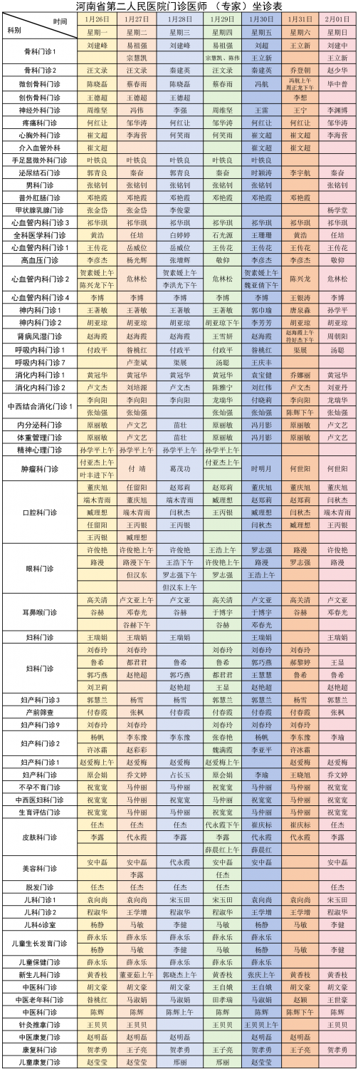 河南省第二人民医院门诊医师(专家)坐诊表(1月26日—2月1日)
