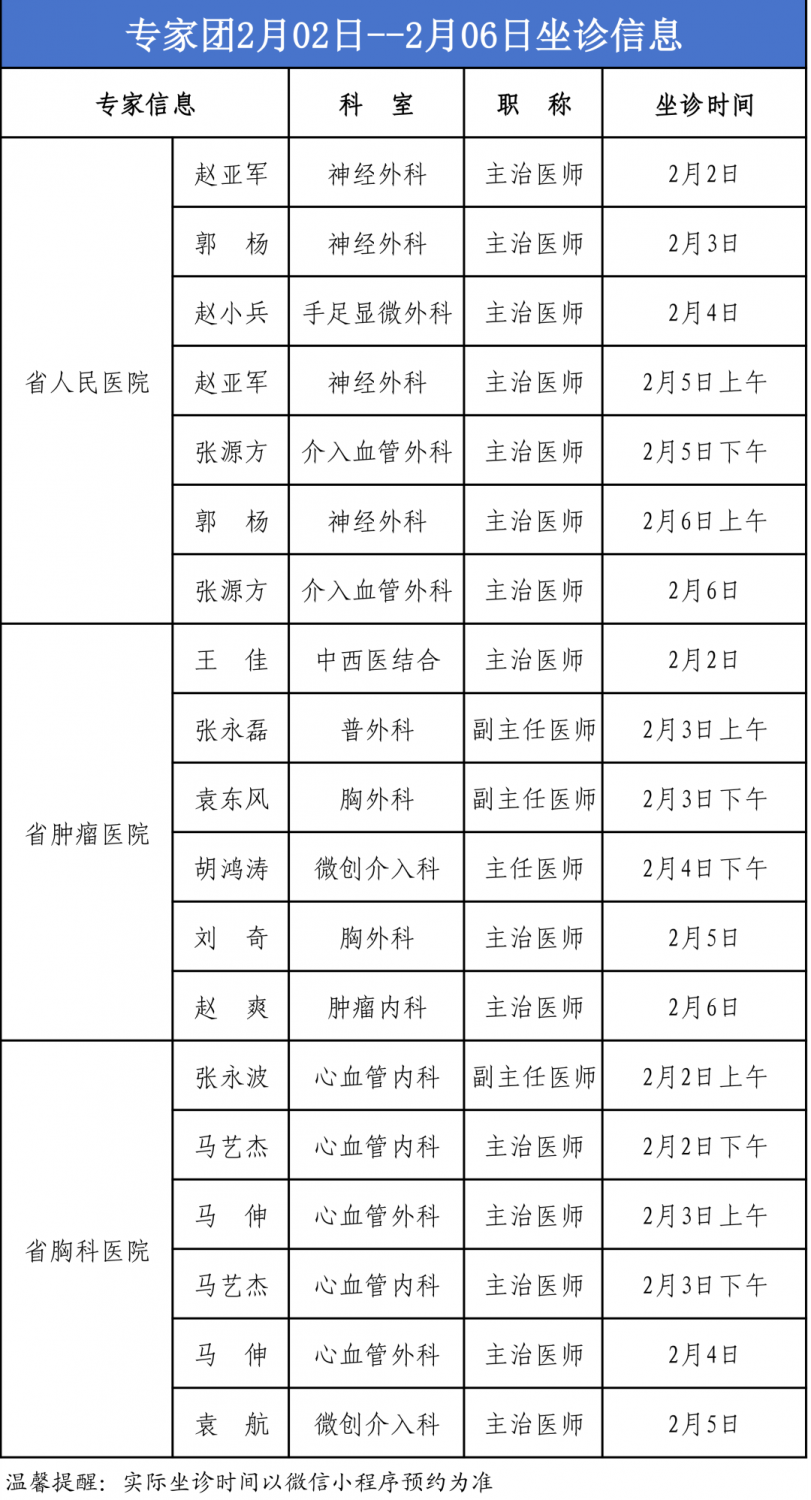 河南省人民医院、河南省肿瘤医院、河南省胸科医院专家团坐诊表(2月2日—2月6日)