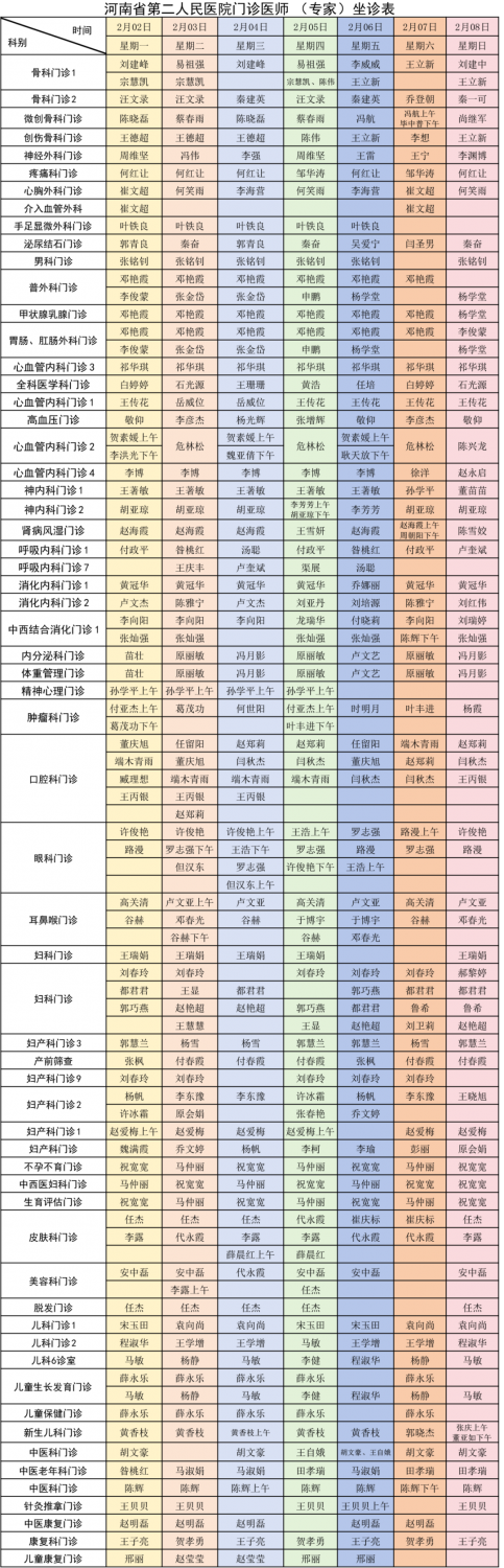 河南省第二人民医院门诊医师(专家)坐诊表(2月2日—2月8日)
