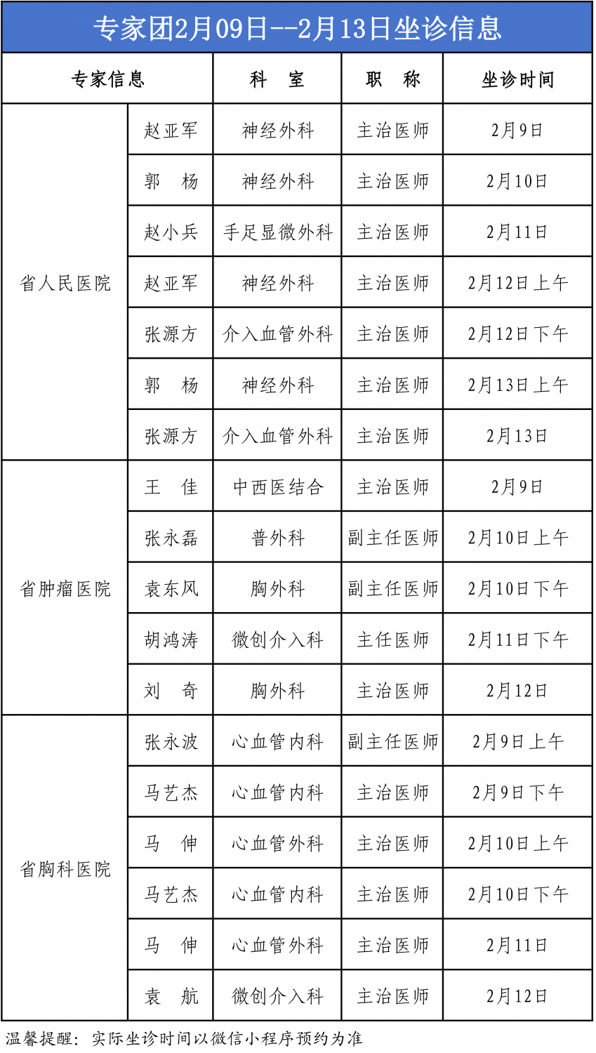 河南省人民医院、河南省肿瘤医院、河南省胸科医院专家团坐诊表(2月9日—2月13日)